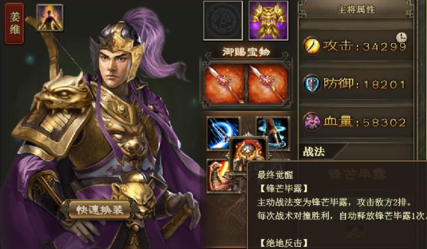 神姜维套装作为攻城掠地中蜀国核心武将的顶级配置,其设计理念围绕强化姜维的智谋与攻防平衡特性展开。该套装包含专属战袍与头盔,基础属性可提升50%攻击力与生命值、30%防御力以及20%命中闪避率,全面覆盖输出、生存与战术稳定性需求。套装激活后还能增强技能效果,尤其在战争迷雾地形中可提升15%行动力,使姜维的突袭与控场能力质变。需注意套装属性需通过105级至125级真系列套装进阶合成,且需搭配特定宝石铭文以激活隐藏效果。