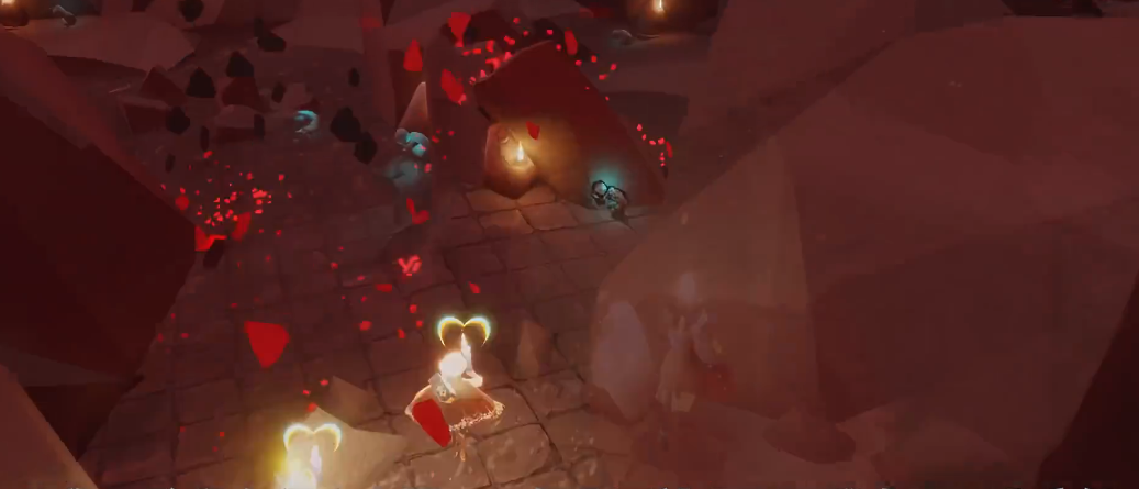 第二阶段可就没安全区躲了,红石会持续往下砸,这时候别犹豫直接硬扛着走。建议贴着墙边移动减少被击中的概率,同时疯狂点击遇见的每尊石像。注意看脚下发光的圆圈,那是先祖们留下的补给点,踩上去能短暂恢复行动力。快到终点时画面会变红,说明马上就要触发献祭剧情了。