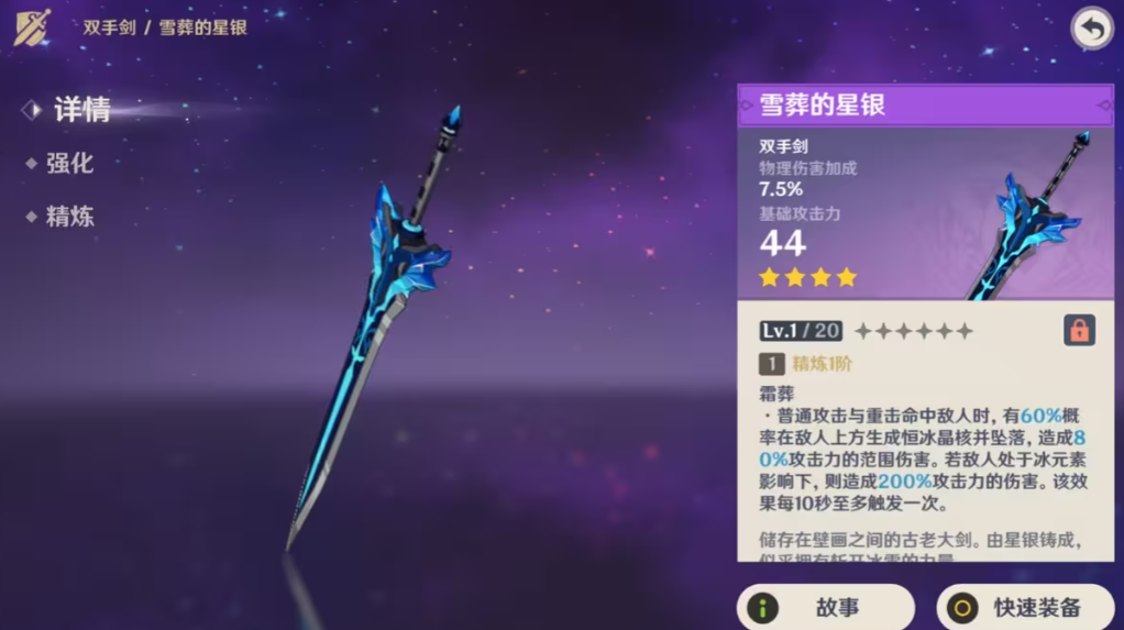 北陆双手剑原胚作为核心材料,可通过击败周常BOSS或使用星辉在商店兑换获取。水晶矿在提瓦特大陆分布广泛,而星银矿则建议沿着雪山特定路线集中采集以提高效率。精炼过程遵循常规武器强化规则,每提升一级精炼等级都会增强武器被动效果踏冰息霜的触发概率与伤害倍率。