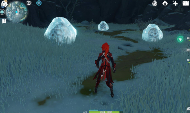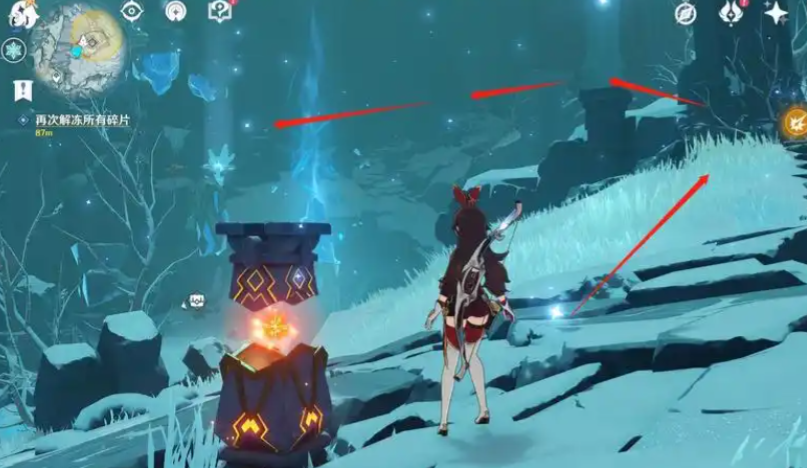 火焰微粒是融化坚冰的关键道具。你需要先找到附近的深赤之石,击碎后拾取就能获得火焰微粒效果,攻击被冻结的碎片就能造成伤害。中央区域的深赤之石被栅栏挡住,必须让两个仙灵归位才能开启栅栏。第一个仙灵在坚冰高处很明显,第二个藏在雪堆里,用火元素角色融化雪堆就能找到它。