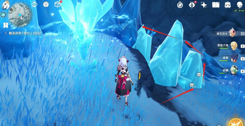 星荧洞窟底部的特殊冰块需要先完成限时挑战解除屏障。开启挑战后会刷新三波敌人,建议携带火系角色快速破冰盾。完成后屏障消失,立刻收集场地内刷新的四块深赤之石,按顺时针方向依次击碎冰块。这里地形复杂容易迷路,可以打开元素视野追踪深赤之石的红色能量轨迹。