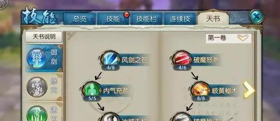 天书加点采用御剑系主导的框架,第一卷优先点满风剑之芒、岐黄秘术与寒冰烈炎,增强基础攻击与暴击属性。第二卷侧重玄经修为与破魔怒意,提升技能连贯性。关键节点如炼神还虚可减少技能冷却,华闪之歌强化真元华闪的斩杀阈值。修元系天书补充内气充盈与雷云奇变,优化真气回复与唤雷决伤害。第五卷天书选择需平衡输出与防御,仙元灌顶与飞剑御空提供机动性保障。