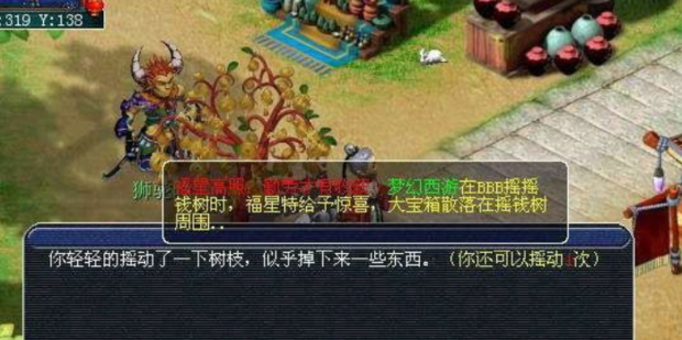 摇钱树成熟后,玩家可以摇动树枝获取奖励,摇动次数取决于照料和特殊事件的处理情况。基础摇动次数为6次,通过处理虫灾和偷盗小贼最高可增加至15次。摇动时会掉落元宝,玩家拾取后可获得金币、特赦令牌、二级药、宝石、强化石、变身卡片、符石、珍珠、海马、彩果、超级金柳露、五宝、魔兽要诀等奖励。财神的摇钱箱是特殊事件中出现的额外奖励,任何玩家均可拾取,但需动作迅速以免被他人抢先。