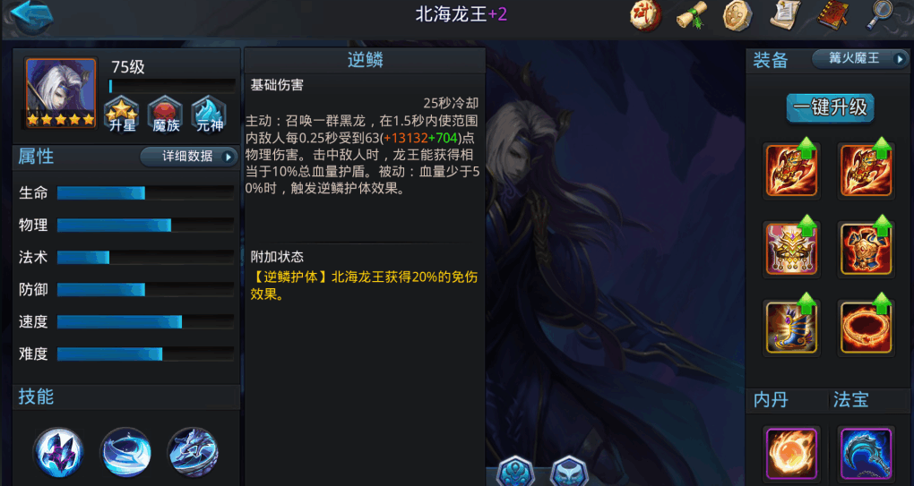 北海龙王在队伍里的定位非常灵活,可以当核心输出,也能作为半肉控场。如果主打排行榜,建议把他放在前排吸收伤害,搭配倏忽和阎罗王形成控制链,拖慢对手节奏。如果是篝火夜话或修罗血战这类玩法,可以走纯输出路线,配合刑天或武德星君快速清场。北海的技能释放顺序也有讲究,先开龙殇剑减速敌人,再用霜龙爪把目标拉到身边,最后开逆鳞打爆发,这样能最大化伤害和控制效果。
