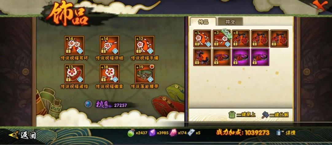 铜币消耗量大,通灵升级、天赋点强化和装备锻造都需要大量铜币,避免无节制挥霍。金币优先用于小队突袭的三倍奖励,其次是高性价比的忍者招募。勾玉和忍玉的兑换顺序需根据当前需求调整,勾玉满级后转向忍玉更划算。饰品选择上,抗魔值高的传说级饰品能大幅提升战力,但要注意穿戴等级限制,逐步替换低阶装备。