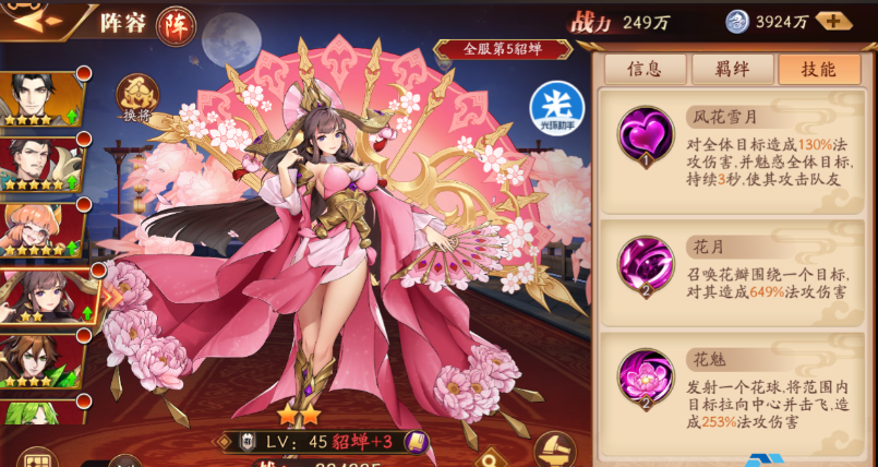 贾诩在游戏中绝对是群雄阵营的核心输出担当,他的大招是斩杀技,敌方血量越低伤害越高,最高能打出600%的斩杀伤害,还能无视底力机制,妥妥的收割神器。被动技能更是神技,场上任何角色(包括召唤物)死亡时,他都能立刻恢复自身法攻100%的生命值,敌人死亡还能永久提升他的法攻,属于越战越勇的类型。这样的技能组合让他成为战场上的死亡收割者,走群雄阵容的小伙伴一定要重点培养他。