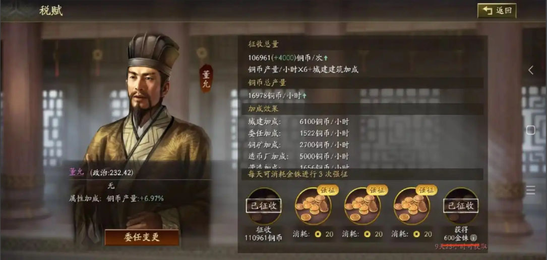 你就明白为啥要费心造厂了。铜币在游戏里是那种时时刻刻都缺的硬通货,从游戏前期到后期都离不开它。前期你需要大量铜币去招募武将,哪怕是四星将也能拆出战法点,这是提升队伍实力的基础。到了中期,每天的寻访贤人和驯养马匹这两个日常活动,就得吞掉一大笔铜币。后期打架更激烈,在营帐里征兵、给武将学习高级兵书,处处都要花钱。光靠主城民居和占几块铜矿地的收入,常常是入不敷出,捉襟见肘。早早规划并建成你的造币厂生产线,就是为你未来的发展打下坚实的经济基础,让你在资源调配上游刃有余。