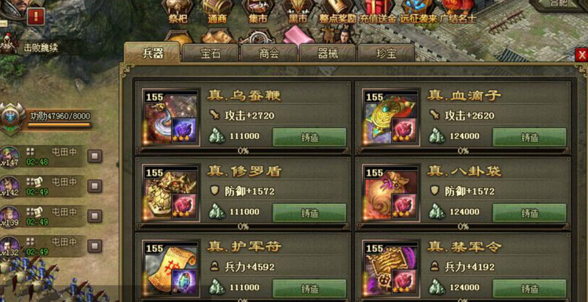 首先自己这边的底子得打扎实,等级这块,硬指标是到87级才能去挑战,所以前期跟着主线任务走,快点冲级是关键。兵器方面,左边全升到61级,右边全19级,是个挺多人用的搭配。装备嘛,追求个平衡就好,主力用那种攻击防御都不错的,像什么444、345、445品质的都行。如果能有三件四星装备,两件攻一件防,平均品质能到445左右,那就很稳了。装备属性上,强防和强攻这两样特别有用,越多越好,像血量这类属性,如果装备洗练的时候能洗掉换成强防强攻会更好。