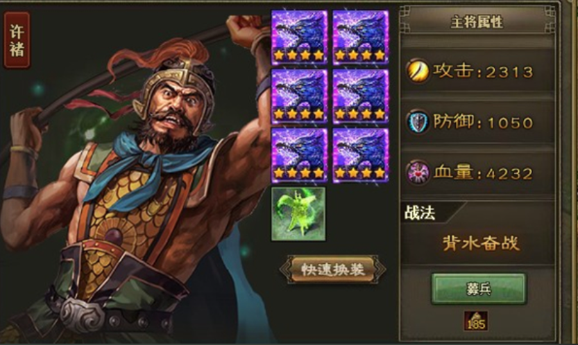 把许褚放在第一个,让他去扛第一排部将的战法,然后靠着平砍和最后一排的战法去消耗。也有结合自己装备情况调整的,比如把最好的装备,尤其是加强防和强攻的,优先给夏侯惇,让他能扛能打;甘宁的装备次之,也堆强防、强攻和强壮;马超则主要堆强防强攻,稍微带一点掌控就行,主要是为了提高抵挡概率,省点粮食;剩下的装备就给许褚,主堆血量和攻击。