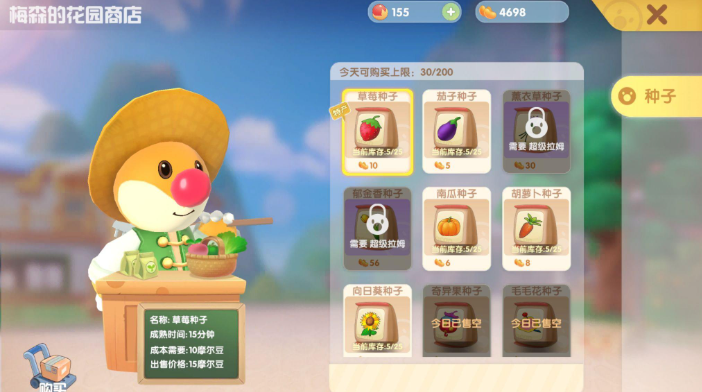 既然提到了制作材料,就顺便说说其他配料的获取。配方里的奇异果和葫芦,它们和毛毛豆一样,主要都得靠种植获得。它们的种子都需要在梅森的种子商店里购买,然后分别种下、等待收获。这个过程其实也体现了摩尔庄园经营生活的核心乐趣——从一颗种子开始,经过浇水呵护,最终变成餐桌上的美味食材,这种完整的体验感是非常棒的。