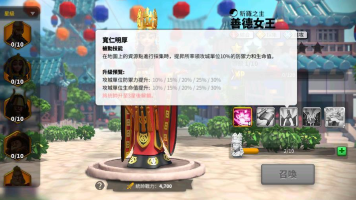 获取女王角色主要通过游戏内活动如周年庆登录奖励,塔玛尔女王和善德女王均为史诗级统帅,适合平民玩家入手,培养成本相对较低,通常等级控制在37级左右即可满足日常需求,无需急于升满或觉醒。资源管理上,女王角色能显著减少采集时间并增加额外资源产量,善德女王的觉醒技能提供负载和采集加成,塔玛尔女王的辅助能力在团队战中提供治疗和防御支持,玩家应注意平衡投入,避免浪费稀有材料如金头,专注于提升整体采集体系的效率。