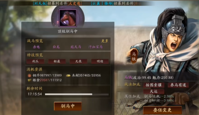 粮食在装备培养系统里也扮演着重要角色,特别是喂马功能可以大量消耗富余的粮食,顶级驯马每日消耗量甚至能达到29万以上。这不仅是消耗粮食的好方法,还能有效提升武将的战力,让你在后期对抗中占据优势。通过将粮食投入驯马,你可以强化装备属性,同时解决库存过多的问题。