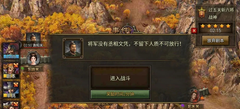 核心思路就是在满足等级和配置门槛后,精确把握事件驱动的节奏,任何一个加时事件都不能遗漏。同时善用突进科技进行战场调度,在多条战线间合理分配武将兵力,通过刷影子来辅助推进。战斗中以单挑消耗为主,保持武将的持续作战能力。只要理解了这些机制并加以练习,你就能在过五关斩六将的挑战中掌控全局,向着五星评价的目标稳步前进。