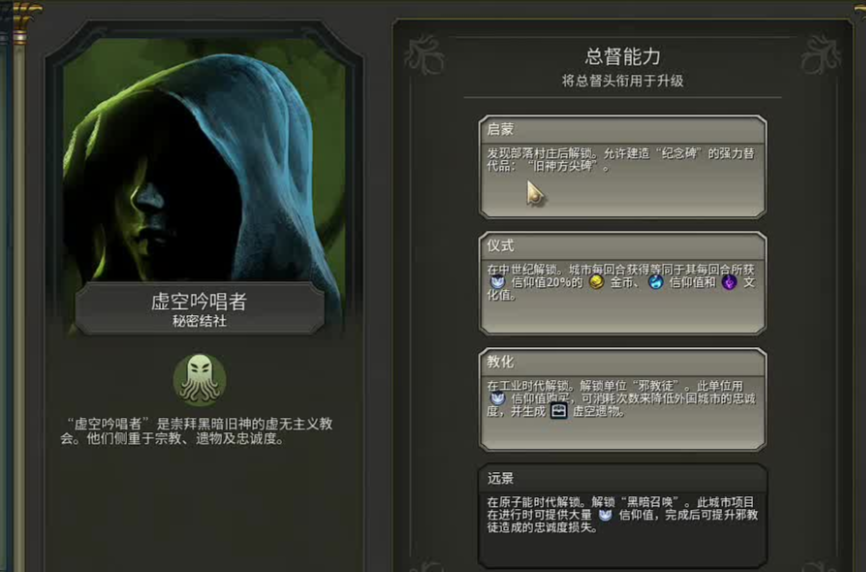 俄罗斯最优先考虑的结社是虚空吟唱者。这个结社能通过信仰转化科技与文化的机制,完美契合俄罗斯文明核动力圣地的爆发力。俄罗斯因其冻土适应性和信仰优势,玩的时候可以根据不同胜利方式选择合适的结社,而虚空吟唱者是最常见且直接的推荐,它能将每回合获得信仰值的一定百分比转化为科技和文化值,有效弥补俄罗斯前期科技发展偏慢的短板。