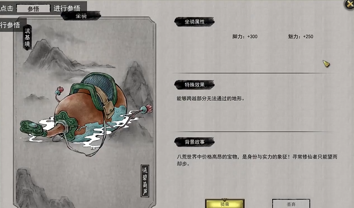 坐骑的属性专注于增强脚力来加快地图移动,以及魅力改善与NPC的关系。一些坐骑如飞舟和祥云在练气期就能提供高额脚力加成,而登仙坐骑玄沧星盘属性优越,象征修仙成就。隐藏坐骑的获取增加了游戏探索的乐趣,玩家需根据自身境界选择合适的坐骑。