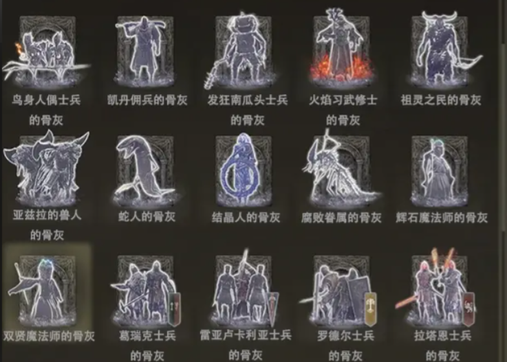 灵魂灰是强化骨灰的唯一材料,它们散落在地图各处,可以通过探索隐藏区域、击败特定敌人、完成任务或从部分商人处购买获得。而在DLC黄金树幽影中,强化材料变为幽影碎片,其获取思路与灵魂灰类似,但集中在幽影之地地图中。强化时根据骨灰的强化等级,会消耗不同数量和等级的对应材料。