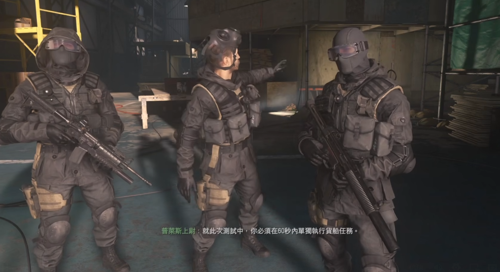 在掌握了基本射击与操作后,关卡将进入模拟实战演习部分。玩家会见到普莱斯上尉并接受进一步指令,需要爬上梯子取得MP5冲锋枪,然后从绳索滑降至模拟战场。落地后,必须严格遵循地面上标记的数字顺序和普莱斯上尉的口令快速推进。流程中包含了在移动中于不同位置射击靶子,以及在特定点位投掷闪光弹后清除房间内目标的战术动作。整个演习环节强调速度与精准度的结合,通常要求玩家在一分钟之内完成全部流程,若未能达标则可以重复尝试,以此锻炼玩家在压力下的反应与战术执行能力。