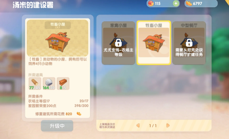 建造牲畜小屋,首先需要完成尤尤的支线任务。前往阳光牧场找到尤尤对话,选择修复篱舍选项触发任务。接着根据指引找到汤米,他会让你进入建筑商店选择修复牲畜小屋。注意修复需要农场主等级达到17级且家园繁荣度达到200点,如果条件不足就先提升等级或装饰家园。