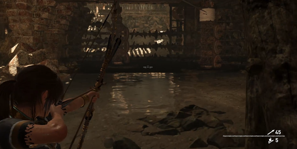 代价水门是一个需要综合运用环境互动与解谜技巧的关卡。首先来到水道入口处,观察场景结构,水门由木质栅栏和绳索机关组成,中央区域有一个可操控的水闸开关。关键操作在于利用木筏作为中介物连接绳索系统,具体步骤为将木筏推入水中,使用绳索箭矢将其与门上的固定桩相连。
