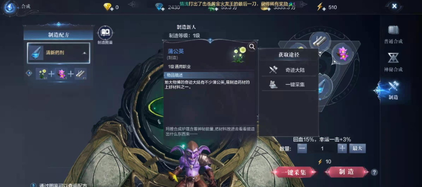 任务涉及多种药剂配方,包括次级治疗圣药、清新药剂及海鲜披萨等实用道具。次级治疗圣药分为三种组合:柏木+蒲公英、槐木+葵花、桦木+白草,均能恢复5%生命值及固定数值。清新药剂由蒲公英与西红花调配,可提升100点攻击与防御,持续1小时。海鲜披萨需小麦、海星和扇贝,提供260攻击力与5%对怪增伤效果。最珍贵的智力果实需槐角与樱花酿合成,可永久增加1点智力属性。