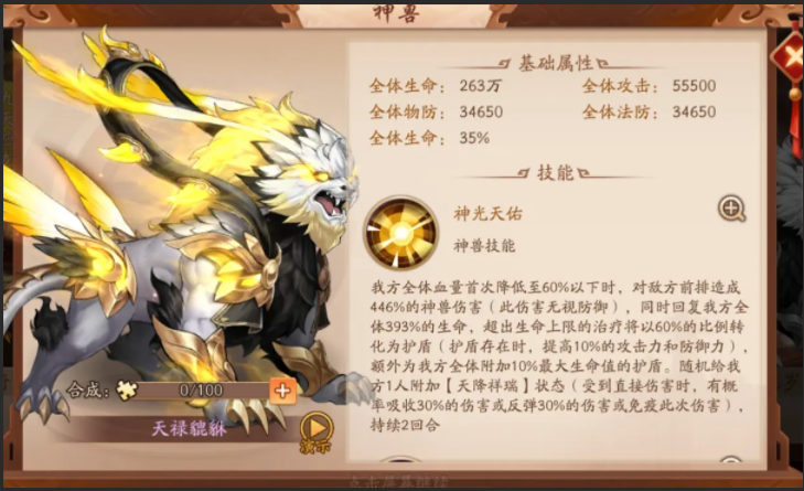 金色神兽在游戏中属于高阶配置,神木青鸾作为治疗型神兽,在己方血量低于50%时触发群体回复,并提供持续治疗与无敌状态,极大提升队伍生存能力。撼地灵犀则展现出强力的控场能力,首回合结束时对前排造成范围伤害并附加眩晕效果,尤其适合先手压制战术。狱火穷奇作为开场触发型神兽,具备减怒和伤害双重效果,在PVP中表现突出。