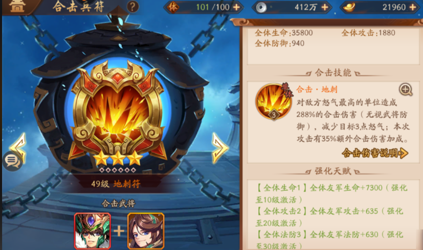 憾天符作为单体收割型合击,在对抗高防御目标时表现突出,它能对生命值最低的敌方武将造成致命打击,并大幅降低目标的防御属性,配合魏国武将的高爆发特性可以快速形成减员优势。枪剑合符作为红色品质合击,虽然激活条件需要群雄武将,但其提供的群体伤害和控制效果能够弥补魏国阵容在面对多目标时的输出压力,建议将其放置在合击序列的3号位以发挥最大效用。救苍生符则是功能性较强的辅助型合击,能为全队提供治疗并概率驱散异常状态,在持久战中具有战略价值。