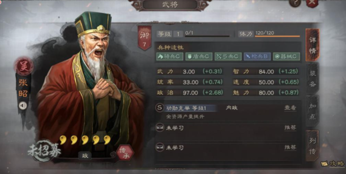 政治属性还影响特殊建筑的运作效果。比如练兵使的政治属性会直接影响练兵经验获取速度,贸易官的政治属性则关系到集市贸易的铜币收益。当你需要快速培养武将或积累铜币时,选择政治属性高的武将来担任这些职位会事半功倍。部分S级内政武将如张昭、蔡邕等天生具备高政治成长,是内政委任的最佳人选。