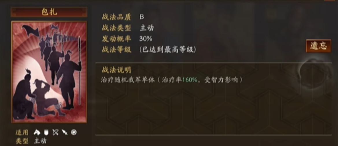 包扎和救援都是恢复兵力的战法,但很多小伙伴发现用包扎的玩家比救援少很多。其实这俩战法各有特点,包扎是每回合给自己回血,不吃属性加成只吃成长加成,后期更有优势;而救援是战斗中让自己获得休整状态,每回合恢复一定兵力,前期开荒特别实用。为啥包扎用得少呢?因为它的发动几率偏低,而且前期效果不如救援明显,很多人更愿意选稳定回血的救援。