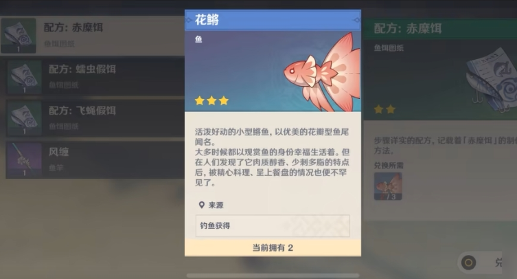 琉璃花鳉是一种活泼好动的小型鳉鱼,以其优美的花瓣型鱼尾闻名。钓取这种鱼类需要使用特定的鱼饵——果酿饵。果酿饵的配方为1个日落果加1个小麦,可在合成台制作,且钓鱼系统开启后会自动解锁该配方。这种鱼饵适用于所有花鳉类鱼种,包括琉璃花鳉、甜甜花鳉、蓝染花鳉等。钓鱼时需注意水面波纹,波纹处即为鱼群汇聚的钓鱼点。
