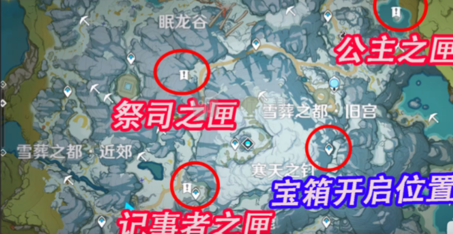 公主匣子位于覆雪之路附近的湖中,触碰湖中剑触发挑战,需击败两名冰属性与一名水属性深渊法师。祭祀之匣位于眠龙谷下方的高台,从传送锚点可快速抵达。记事者之匣需在指定石碑处献花获取。三个匣子集齐后,可开启密室大门。