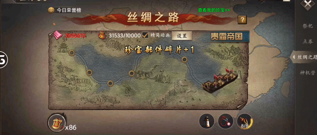 跑珍宝是获取碎片的主要方式,建议在珍宝活动期间集中进行,以提高性价比。活动期间购买丝绸、锦囊等道具可加速珍宝进度,但需注意金币消耗。非R玩家可通过招商令提升效率,满100神兵后每日封地可缩短珍宝培养时间。西域锦囊可替代部分金币消耗,降低培养门槛。