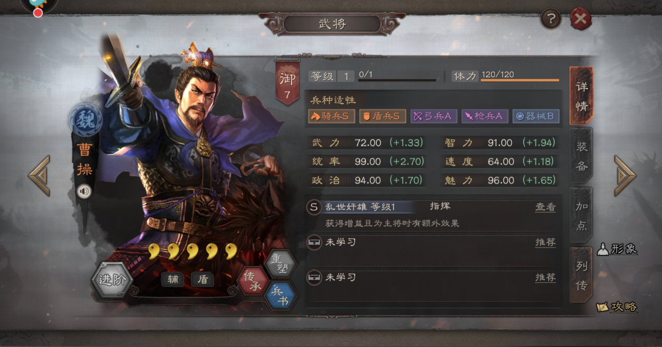 兵种适应性方面,盾兵S级是最佳选择,因为孙坚的盾兵适应性强,能更好地发挥肉盾作用。骑兵和枪兵A级适性可作为备选方案,根据敌方阵容灵活切换。加点时,孙坚建议以统率为主,因为他的统率成长高达2.05,主加点统率能让他承受更多伤害。曹操则可以均衡提升统率和智力,或者全统率加点,这样既能增强防御又能提高谋略伤害效果。这种配置能帮助队伍在各种战斗环境中保持韧性。
