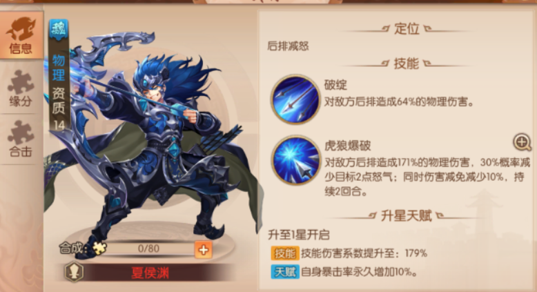 张郃是一位极具特色的魏国红将,他的定位偏向于高爆发的物理输出,并附带不错的控制与持续消耗能力。其主动技能如影杀能对目标及相邻单位造成范围伤害,而料敌机先则能提升自身暴击与闪避,强化生存与输出。更为进阶的绝道张郃拥有更复杂的机制,其怒气技百变断魂可对前排造成大量伤害,并施加传导与断粮效果,前者能将伤害扩散,后者则能限制敌方回复怒气,打乱战斗节奏。他的元素变身状态和被动善阵带来的集火、狂暴增益,进一步放大了其作为核心输出的价值,使其在战斗中能有效针对并快速削减敌方关键目标的血量。