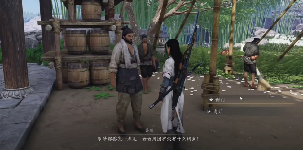 接取任务后,玩家需要寻找第一个线索来定位头坛酒的下落,这个线索位于存香塔下的梨花树旁,玩家可以在那里找到一撮黄毛,这表明头坛酒是被猿猴偷走的,找到这个线索后,玩家就能获得进一步的方向,从而继续追踪头坛酒的具体位置。
