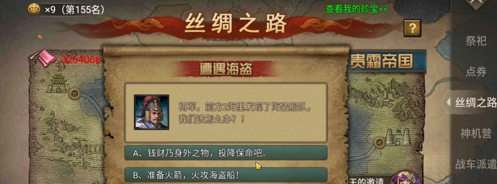 珍宝系统是提升实力的重要一环,而获取第一件珍宝(俗称一珍)则是很多玩家遇到的第一个重要节点。新人朋友可能会觉得这个过程有点复杂,但只要掌握了基本的路子,就能顺利拿到。获取一珍的核心途径是参与游戏里的丝绸之路玩法,通过派遣武将完成路线事件来收集珍宝碎片。这个过程中最关键的是要学会合理使用西域锦囊这个道具,它可以帮助你更顺利地通过路线上的事件,避免不必要的失败和资源浪费。