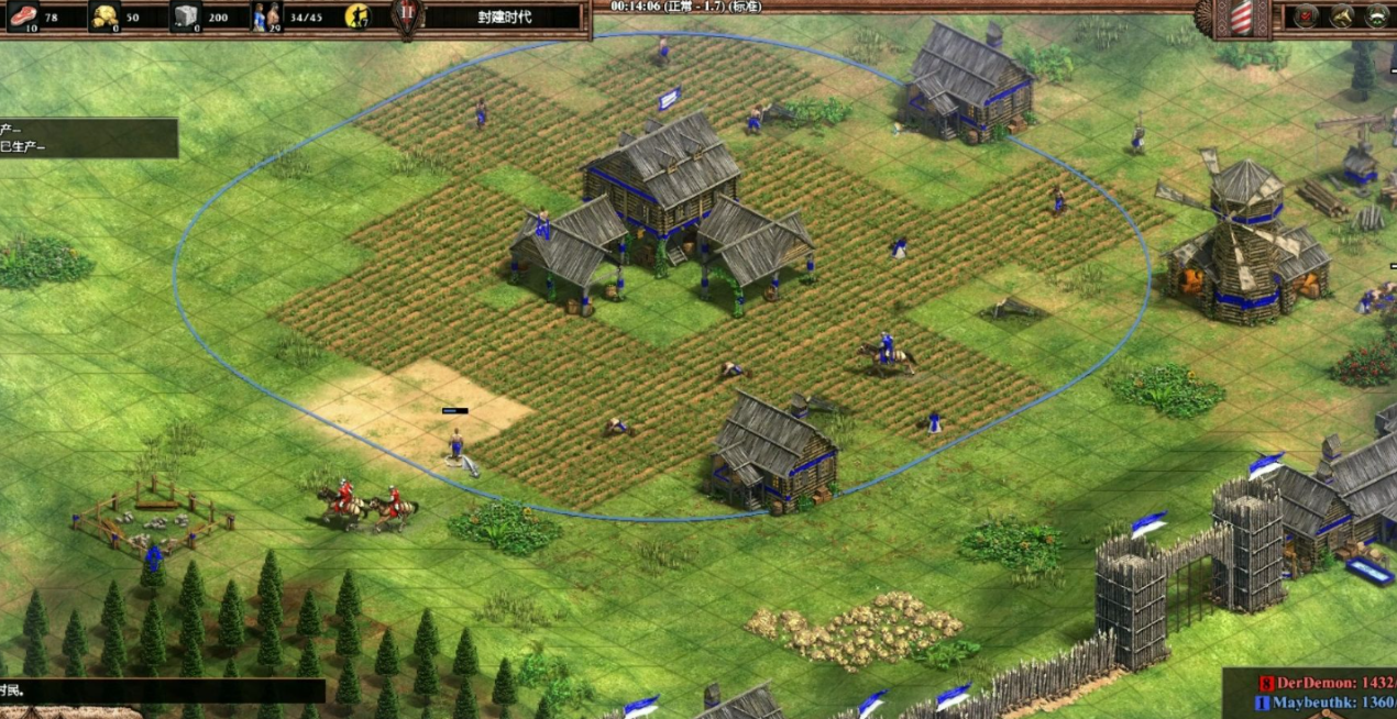 细节决定成败,咱们在操作时可以用个小技巧:用Shift键批量种田后,再全选农民右键一块田,这样他们会自动分配人手而不是扎堆种完一块再种下一块。平时多观察高手对战视频,学习他们怎么用建筑和地形卡位来保护农田,比如用箭塔或城墙围住资源区。还有个小秘密是侦查骑兵不仅能探路,还能顺便把野鹿赶到城镇中心附近,省下农民跑路的时间。