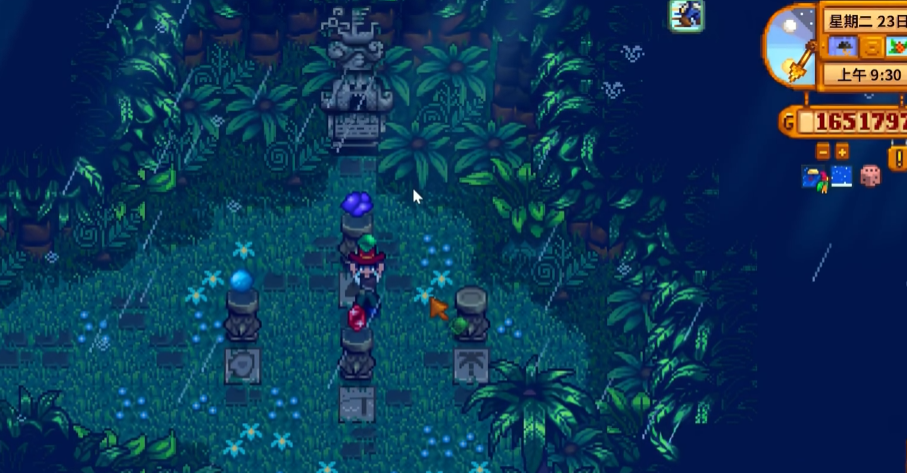 宝石祭坛位于姜岛(Ginger Island)的丛林区域,具体位置需要通过鹦鹉特快丛林传送点下方的隐藏通道进入。祭坛由四根石柱组成,分别对应红、紫、黄、绿四种颜色的宝石。激活祭坛需要在下雨天收集宝石鸟掉落的宝石,并按照方位摆放。
