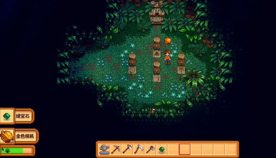 摆放宝石时需遵循方位对应规则:丛林神龛放红宝石,码头神龛放绿宝石,小溪神龛放紫宝石,火山神龛放黄宝石。确认颜色与方位匹配后,将宝石放入石柱即可激活祭坛。完成后可获得5个金色核桃奖励,这是解锁姜岛后续内容的重要资源。