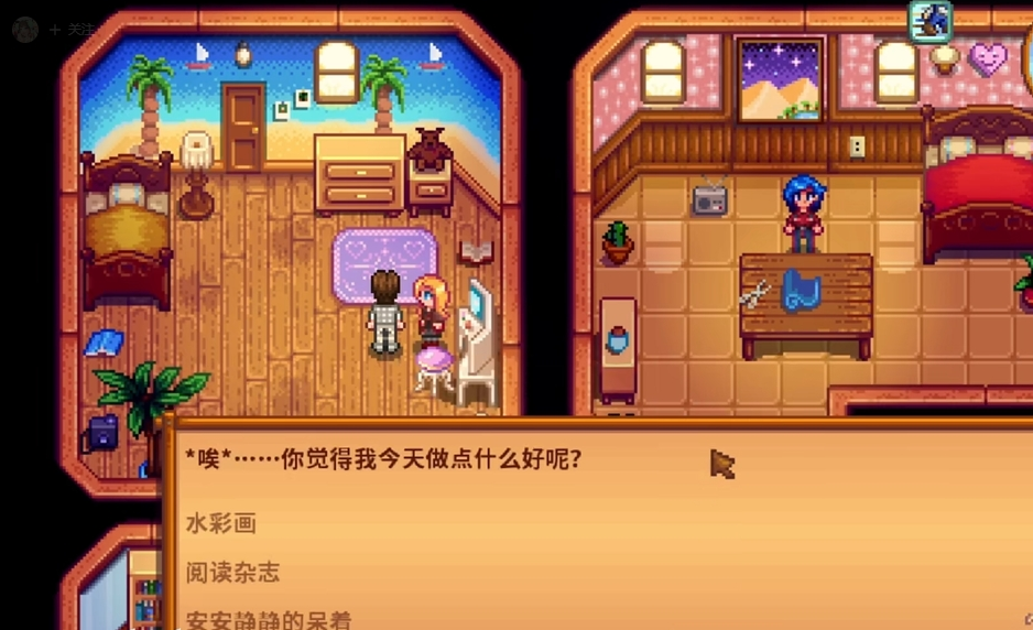当海莉提出今天做点什么好的互动问题时,选择水彩画或阅读杂志可分别增加10点好感度,其中阅读杂志的加成略高。需特别注意避免选择安安静静待着,该选项会导致好感度大幅下降30点。这一对话机制属于海莉日常互动中的重要环节,直接影响角色关系发展进度。