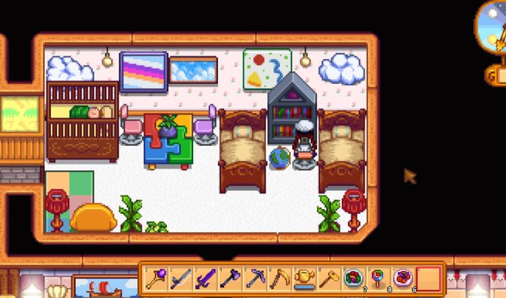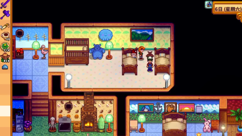 具体的建造工作需要前往位于小镇北部的木匠商店,找到店主罗宾进行操作。需罗宾每周二会外出不在店里,前往前需避开这一天以免白跑一趟。当满足所有升级条件后,支付资源与金币即可开始建造,升级工程需要三个游戏日来完成,在此期间玩家可以照常进行农作、探索等其他活动。工程完工后回家,便会发现育婴室已经自动建成,房间内自带婴儿床,无需玩家额外购置基础家具。